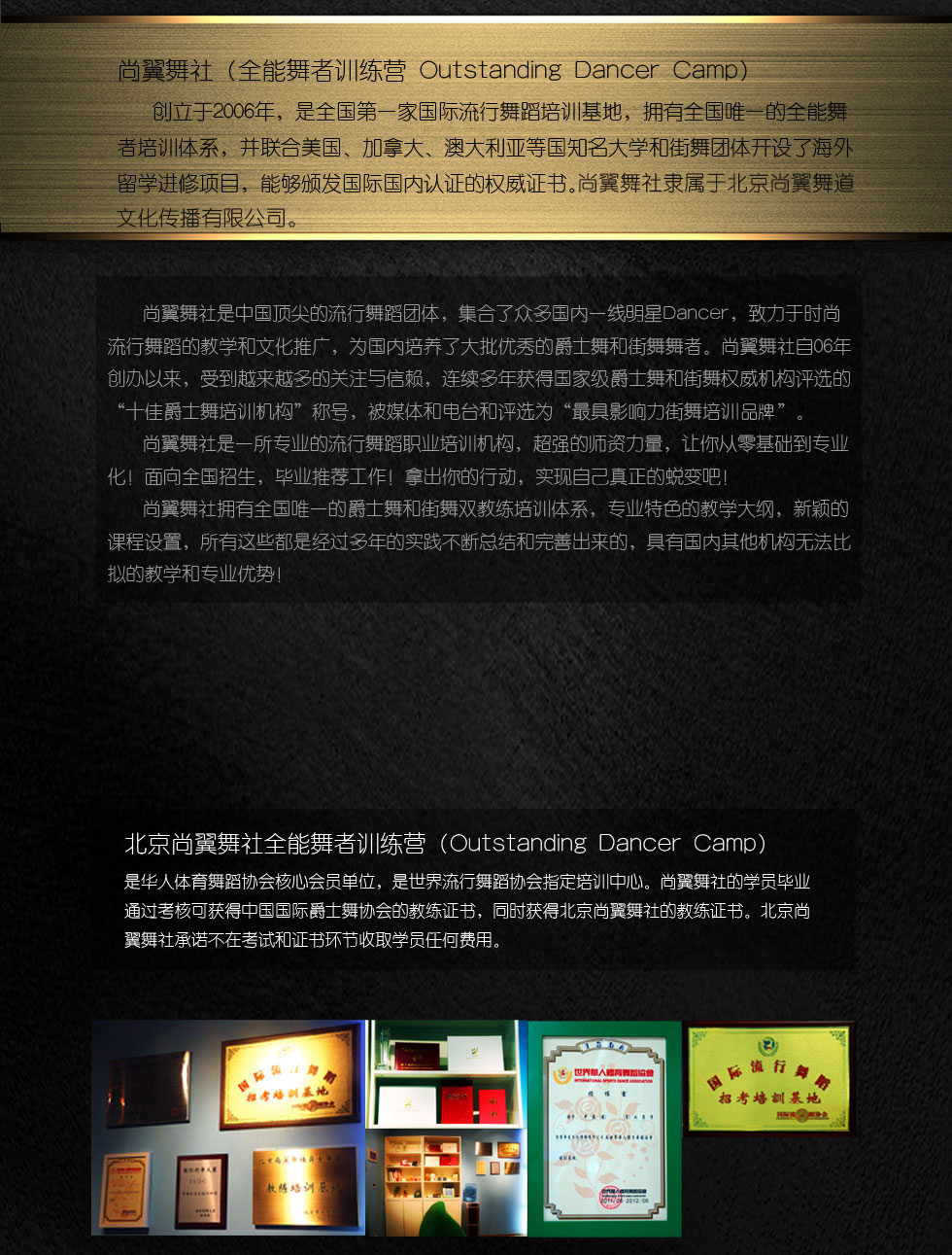 尚翼舞社是中国唯一一家爵士舞教练培训体系中包含街舞教练培训课程的职业培训机构,是经由国家体育总局认可的国际流行舞蹈协会招考基地,北京爵士舞教练培训基地、北京街舞教练培训基地和北京拉丁舞教练培训基地,是世界华人体育舞蹈协会成员。从尚翼走出的学员均于全国各地的健身房、电视台的舞蹈表演和编排部门,还有很多加盟尚翼开办了自己的舞蹈工作室。加入尚翼,还能获得赴美国留学深造的机会。
