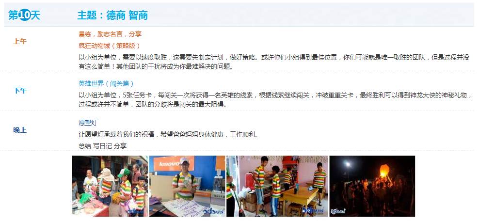 2.每一天我们会把孩子的活动情况通过照片,视频等方式上传到官网,家长可以实时的关注孩子在夏令营的活动情况。