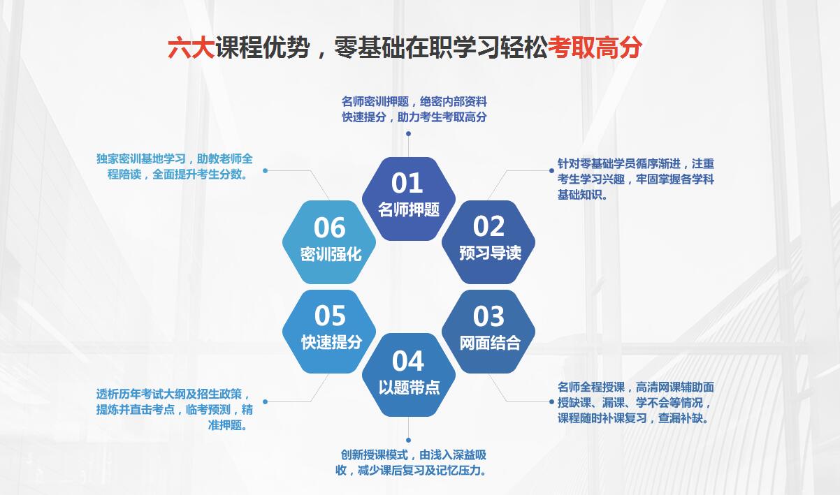 | 模考冲刺班 | 11月3日-12月9日 | 共计: 112课时 | 把握和研究命题者意图,琢磨命题思路,模仿标准答案答题方式,运用于考试。有重点地学习,查漏补缺,加深理解记忆。期末顺利达到考入优秀水平。 |