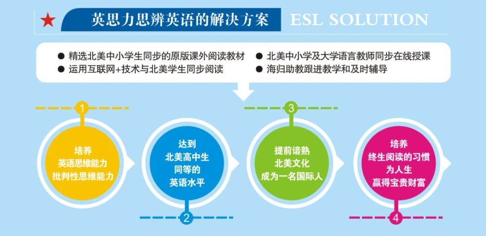 英思力思辨英语针对9至18岁学生,精选北美中小学生在读的课外阅读书目,让中国学生与北美学生同步阅读,以培养学生的英文阅读习惯、英语思维能力及批判性思维能力,通过长期、大量的阅读和课堂讨论实实在在提高学生的英文能力。并通